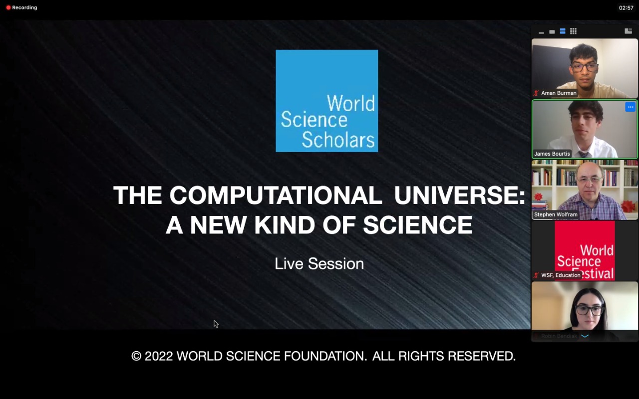 I was accepted to the prestigious World Science Scholars program where 40 of the top young mathematicians and scientists are selected annually to take part in a 2-year program. Each year a cohort of high school aged students from across the globe are selected to expand their mathematical abilities by applying math to the sciences as they participate in inspiring college-level experiences led by world-renowned scientists. Fields addressed range from astrobiology to computational programming to neuroscience. As a part of WSS, I was involved in cutting edge research alongside world-renowned scientists including Brian Greene, Stephen Wolfram, Cumrun Vafa and Suzana Herculano-Houzel among many others. I have also attended following courses as a part of WSS - Space Time and Matter by Professor Brian Greene, Vulnerable By Nature: Creating Phylogeny to understand cause of various diseases by Dr Barbara Natterson-Horowitz , MD and Cardiologist, UCLA, Aristotle's Four Forms of Causation by Dr George F.R Eliis (Astrophysicist) and Computational Language by Dr Stephen Wolfram.