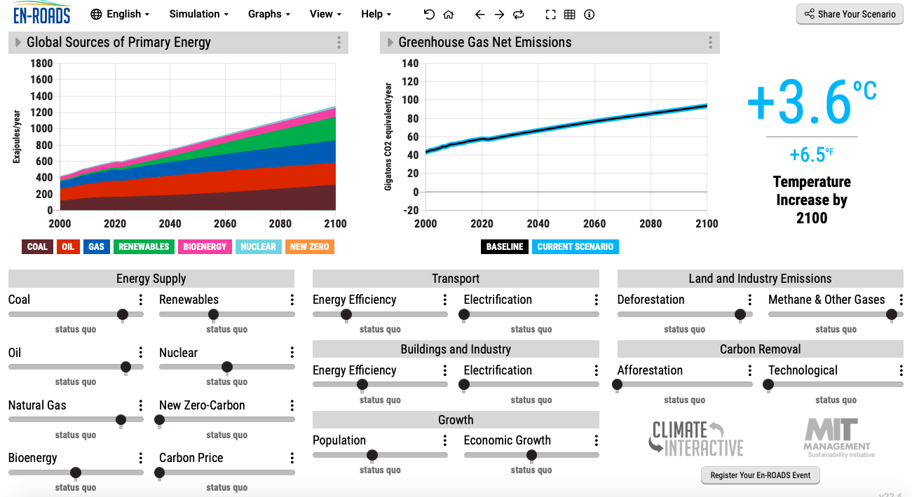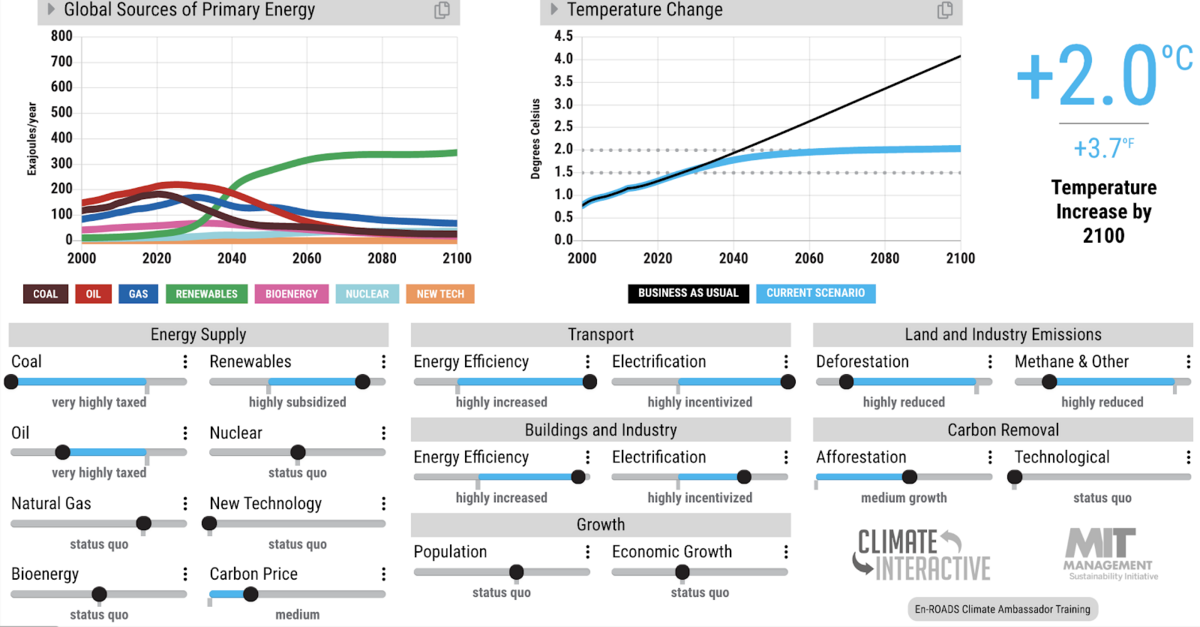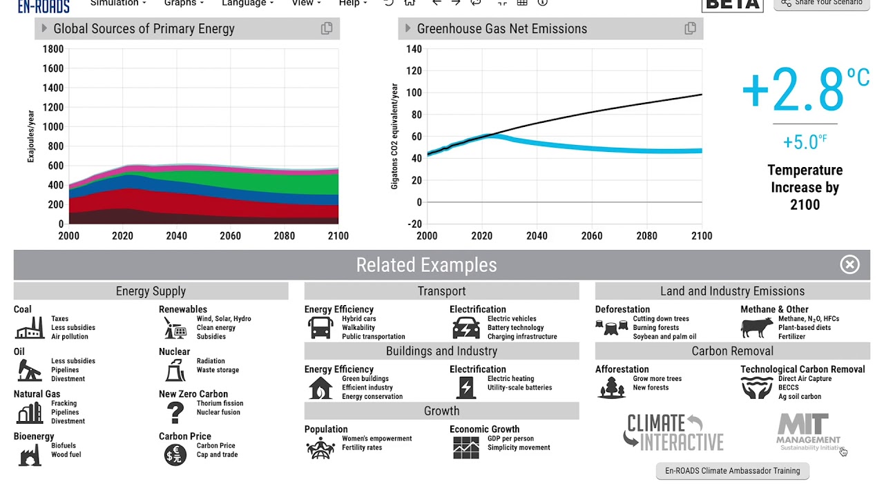 Climate Interactive creates and shares tools that drive effective and equitable climate action. En-ROADS , a powerful, free, online simulation software was developed in collaboration with the MIT Sloan Sustainability Initiative.