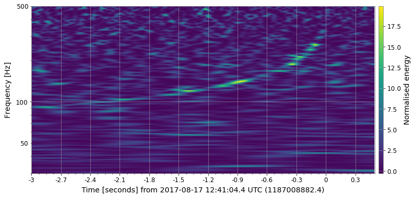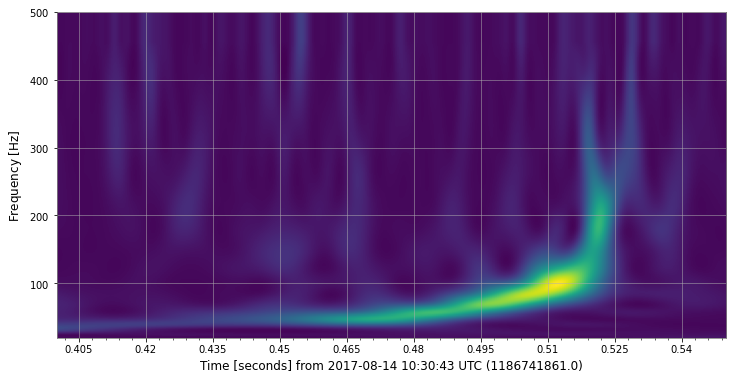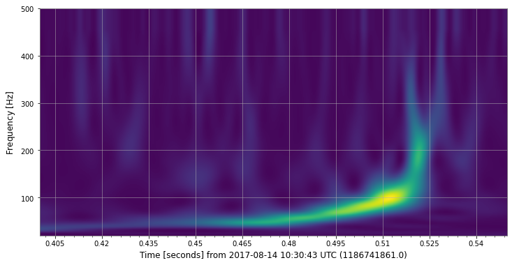 t, f, p = data.whiten(4, 4).qtransform(.001, logfsteps=100, qrange=(8, 8), frange=(20, 512))